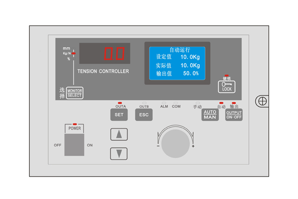 KTC838全自動與卷徑張力控制器采用圖形液晶顯示器,可選擇中、英文顯示,界面友好易用,可輔出CH24V/4A直接驅(qū)動磁粉離合器,磁粉制動器,也可以輸出0~5V,0~10V信號,控制變頻器,伺服電機(jī)或其它執(zhí)行機(jī)構(gòu),對卷料系統(tǒng)進(jìn)行高精度的張力控制。KTC838全自動與卷徑張力控制器廣泛應(yīng)用于造紙、印刷、包裝、紡織印染等行業(yè)。