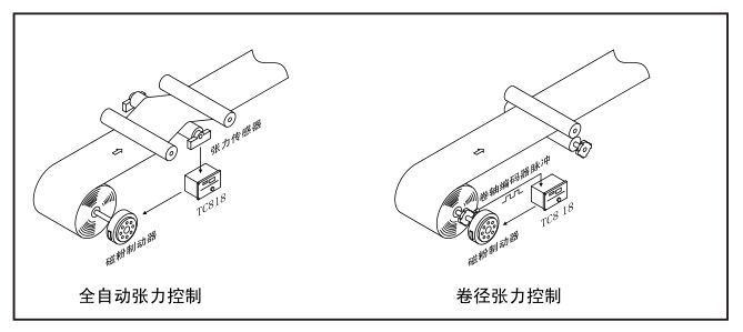 KTC83全自動與卷徑張力控制器8可以設(shè)置為全自動張力控制器或卷徑張力控制器,當(dāng)功能選擇[28] m設(shè)置允自動張力控制時,KTC838為全自動張力控制器,需安裝張力傳感器組成閉壞控制系統(tǒng)。當(dāng)功能選擇[28]設(shè)置為卷徑張力控制時,KTC838為卷徑張力控制器,只需安裝接近開關(guān)/編碼器對料卷半徑進(jìn)行測S,控制器根據(jù)卷徑進(jìn)行張力控制。